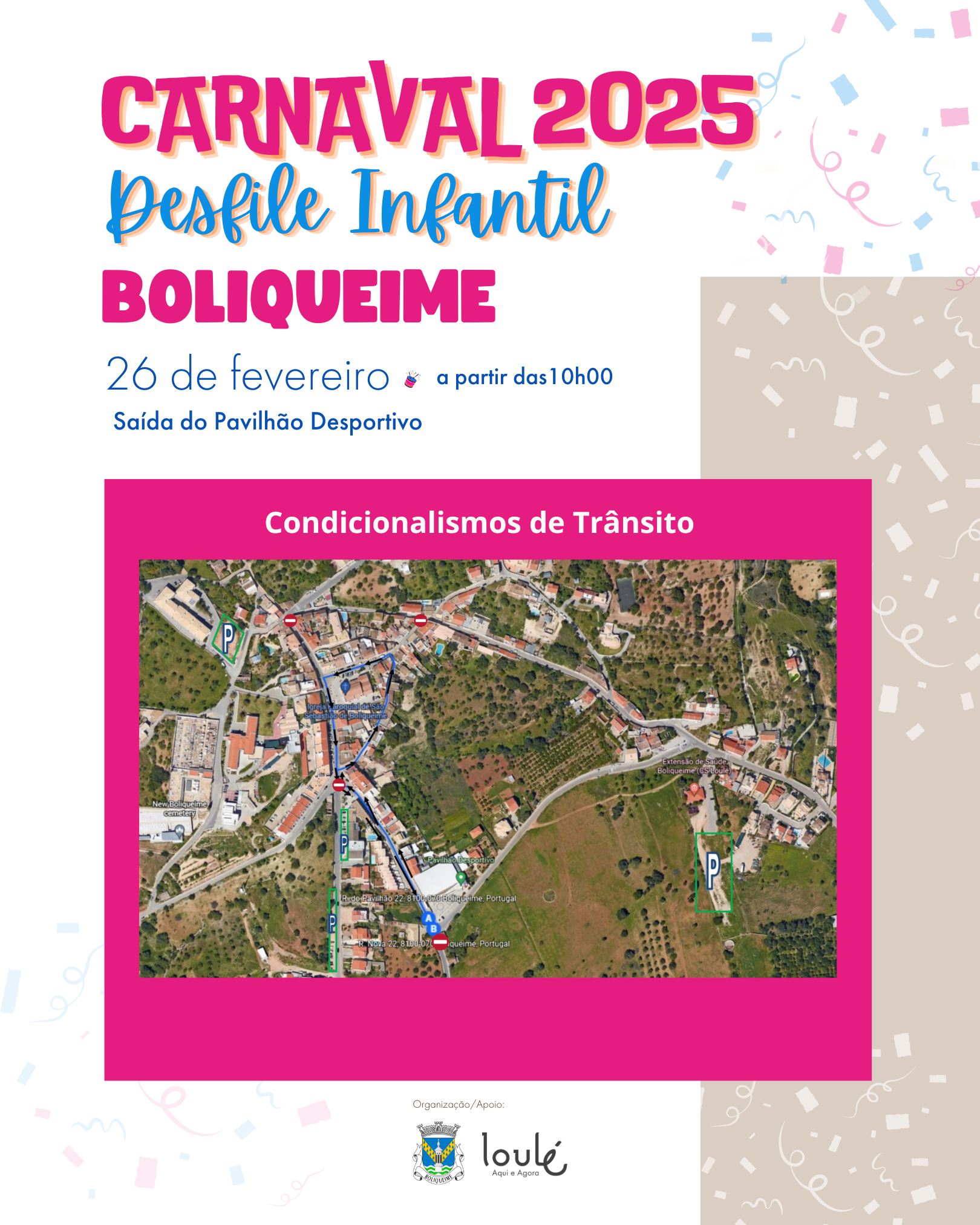 Por favor, tenha em conta as condicionalismos de trânsito previstos para esta quarta-feira, 26 de fevereiro, entre as 8h00 e as 13h00, em virtude da realização do Desfile de Carnaval Infantil de Boliqueime.