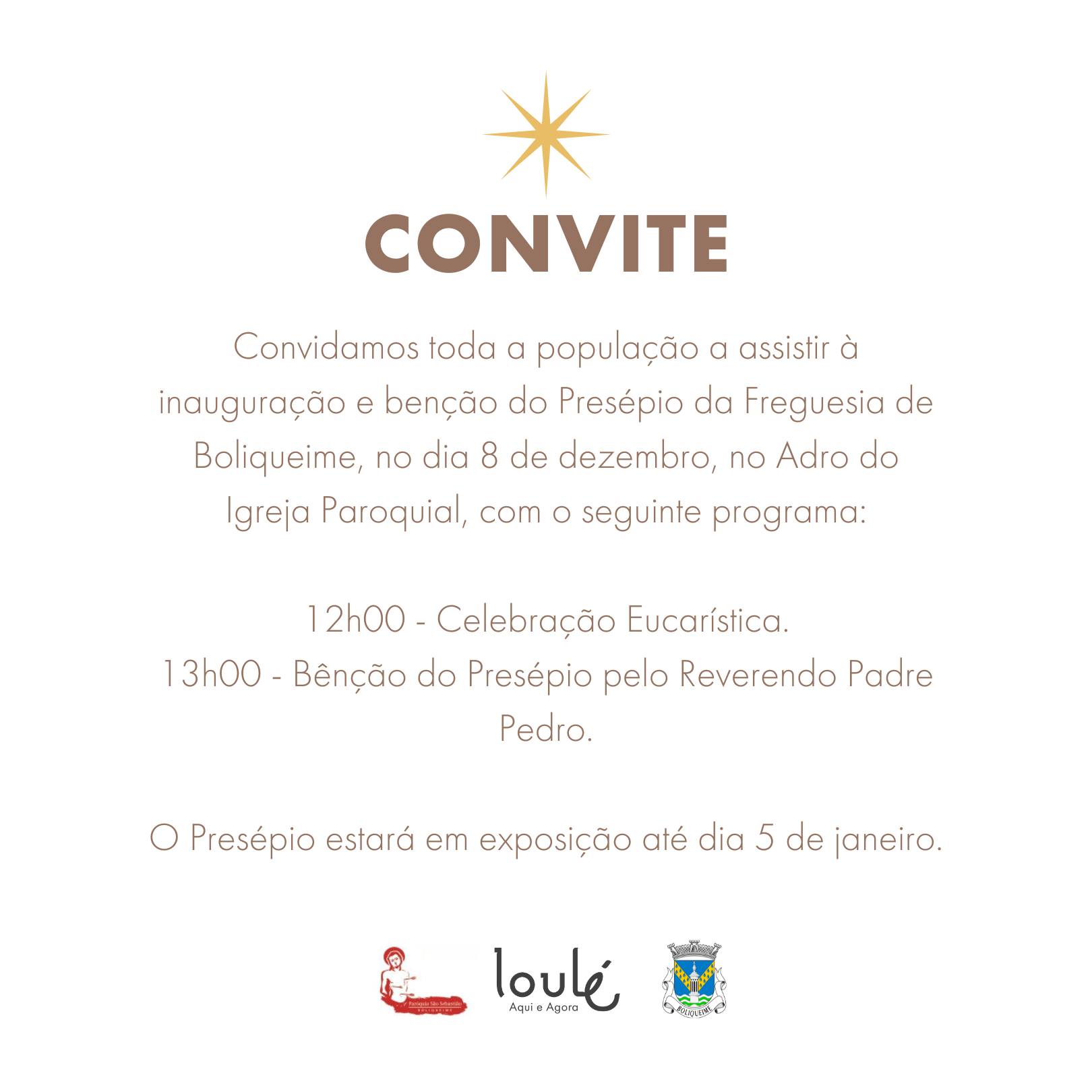 Convidamos toda a população a assistir à inauguração e benção do Presépio da Freguesia de Boliqueime, no dia 8 de dezembro, no Adro do Igreja Paroquial, com o seguinte programa:
