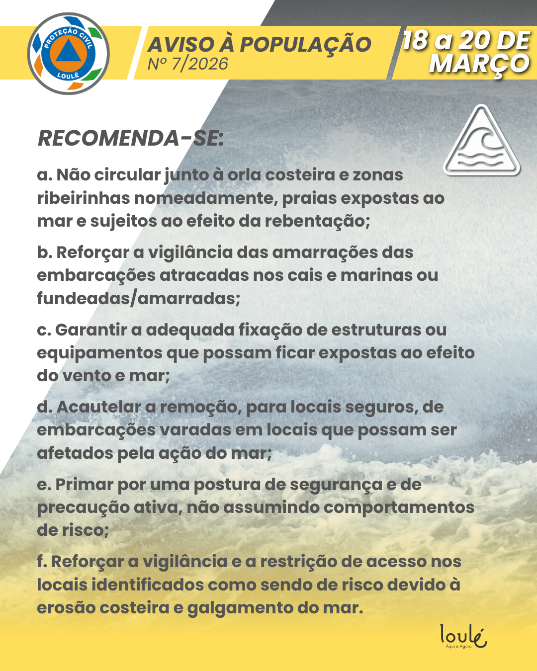 O Serviço Municipal de Proteção Civil de Loulé alerta para chuva intensa, vento forte e agitação marítima previstos para os dias 18, 19 e 20 de março.