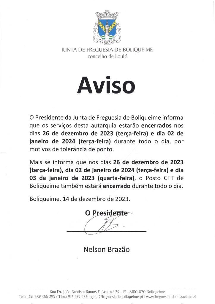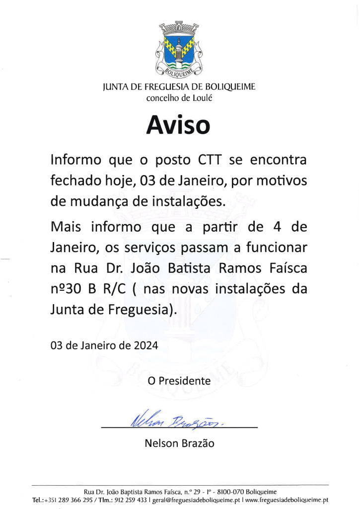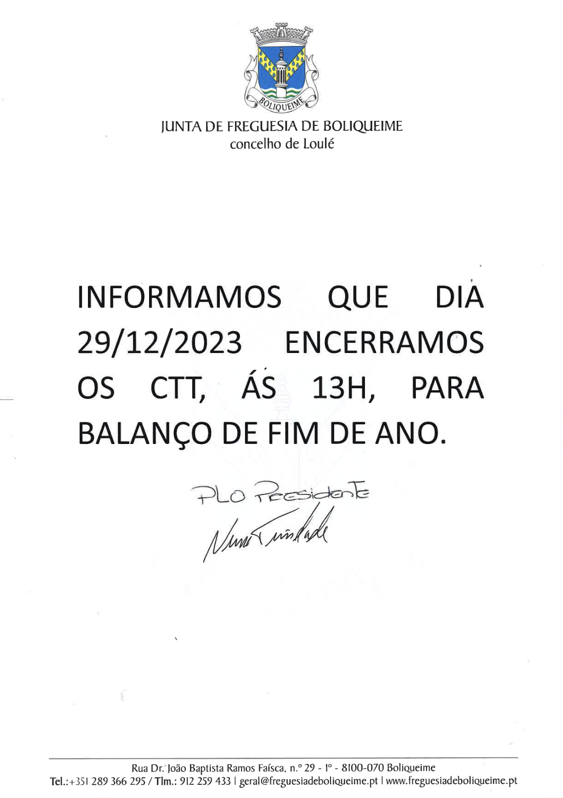 Aviso - Encerramento do posto dos CTT por motivo de...