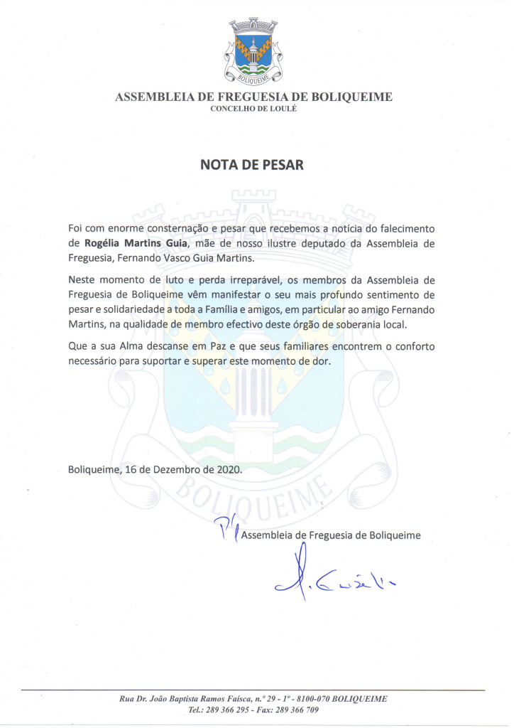 Nota de Pesar da Assembleia de Freguesia - Falecimento da...
